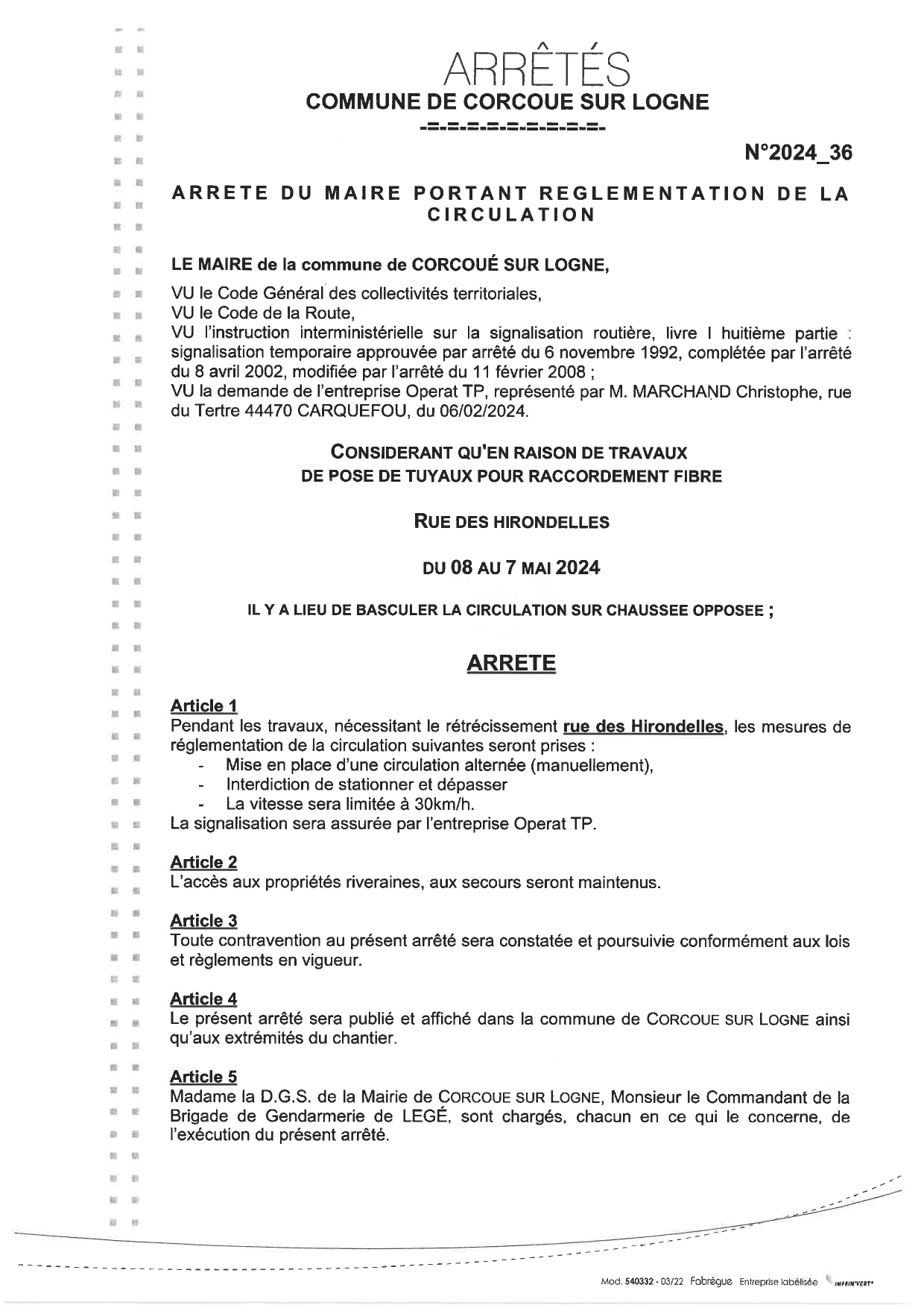 Arrêté N°36- OPERA TP Rue des Hirondelles