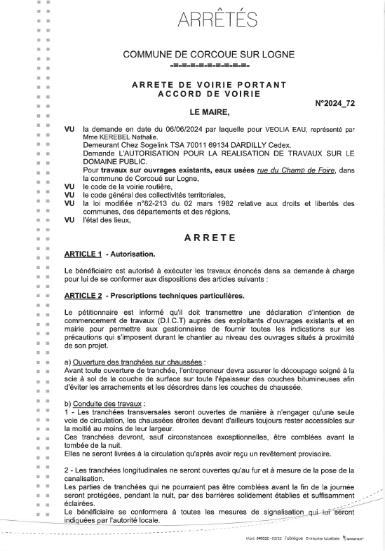 Arrêté n°2024_72 - Permission voirie - Rue du champ de Foire - VEOLIA