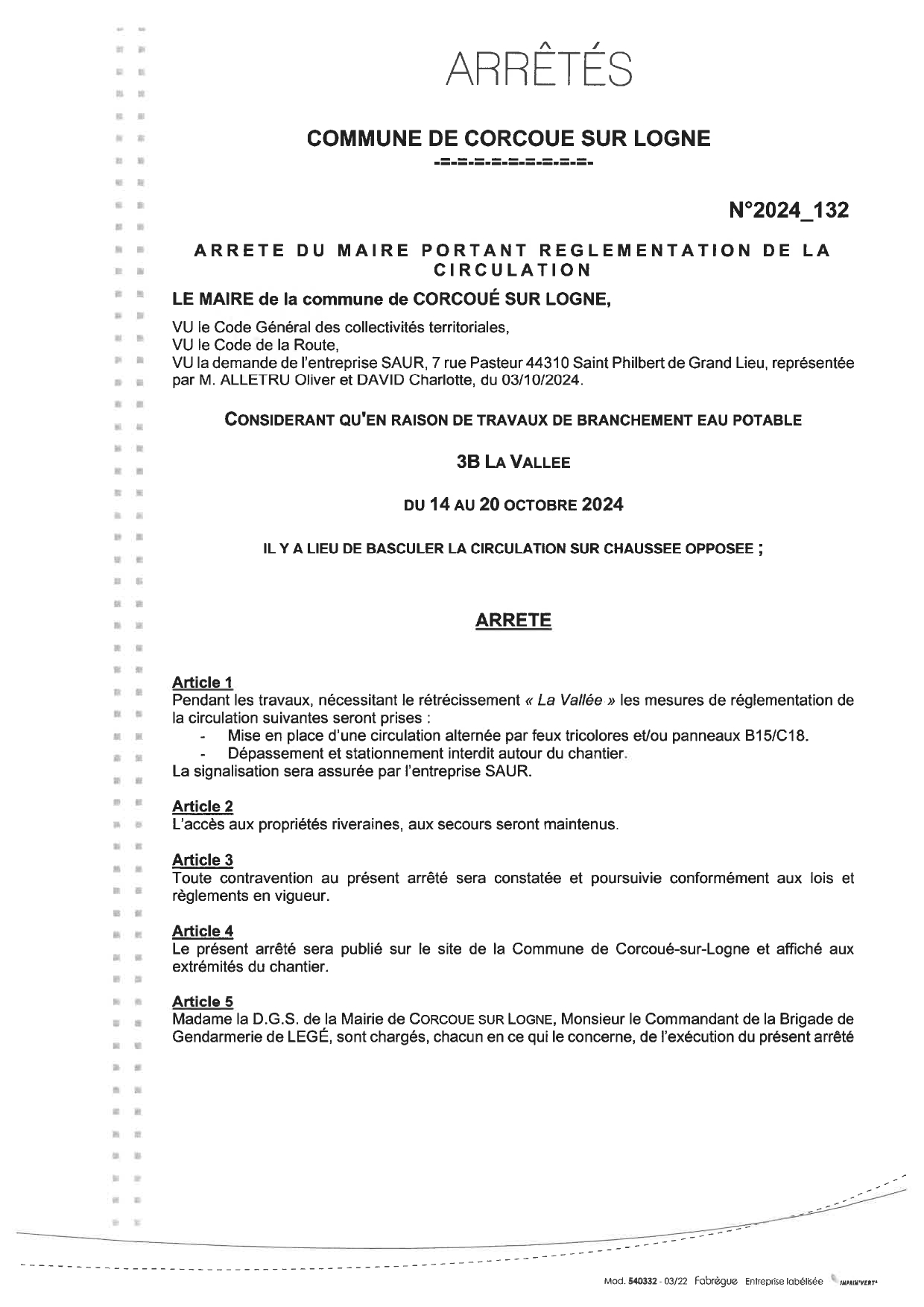 Arrêté N°132 - SAUR 3B LA VALLÉE