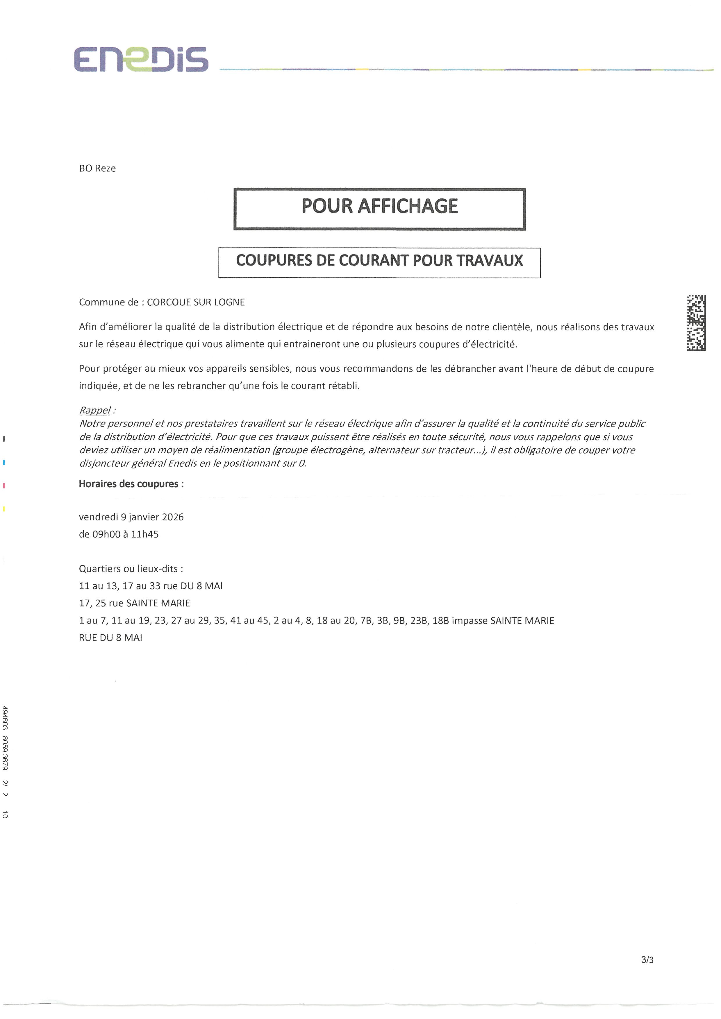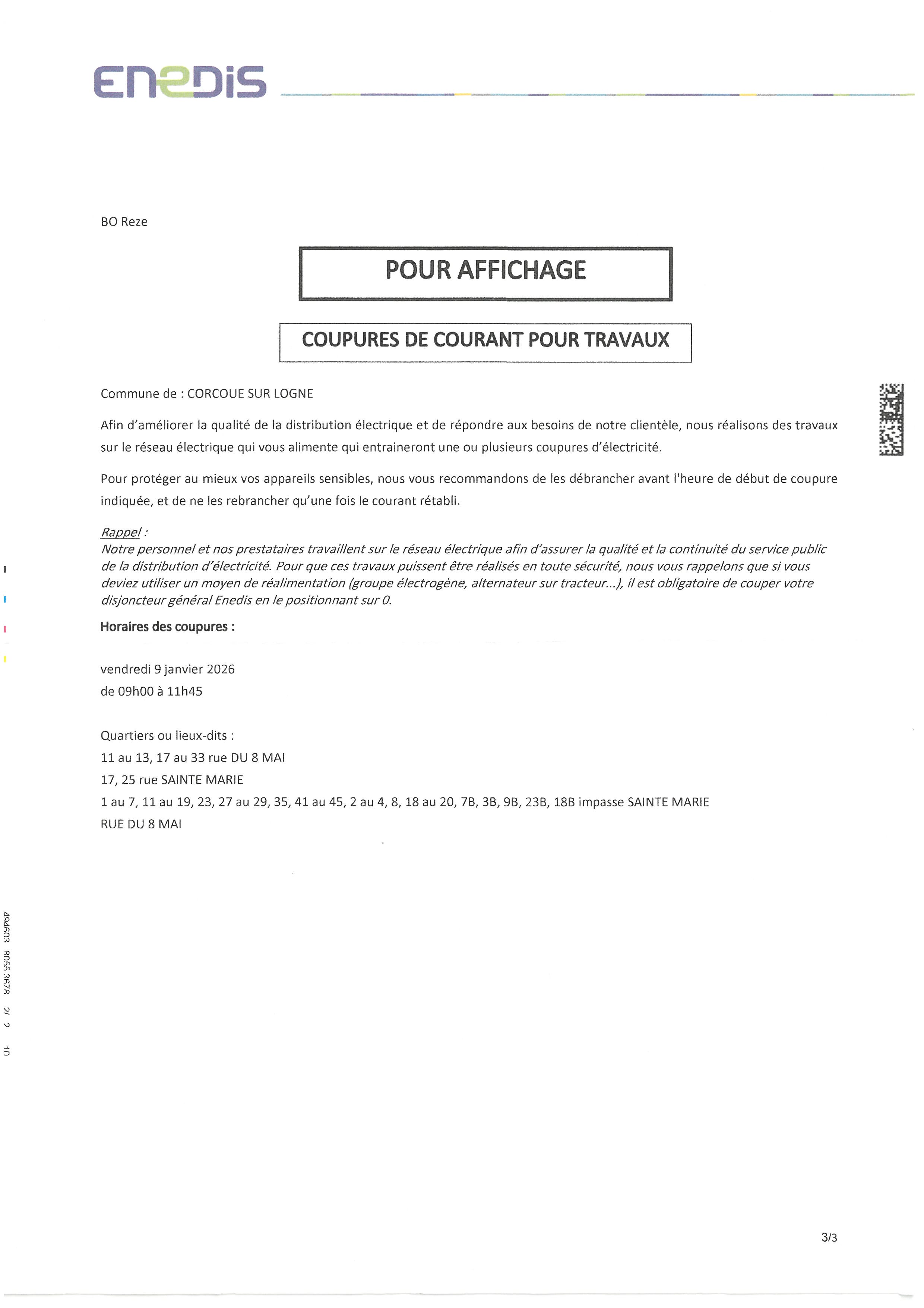Enedis nous informe que plusieurs coupures d'électricité auront lieu sur la commune, merci de prendre connaissance des documents suivants.