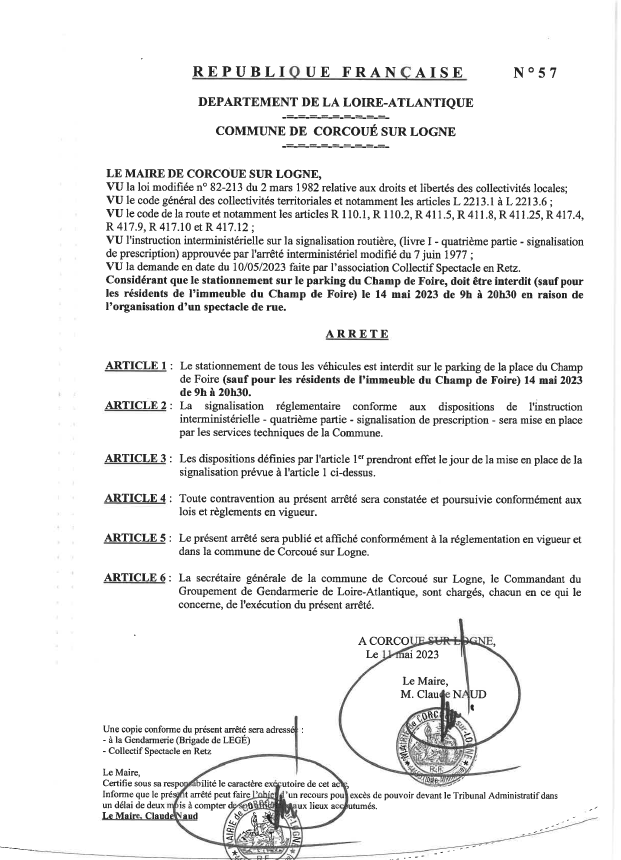 Arrêté N°57 - Arrêté de stationnement - Parking champ de Foire - Collectif Spectacle en Retz