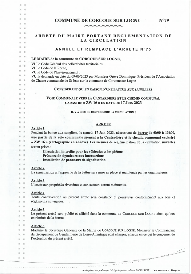 Arrêté N°79 - Route Barrée - La Cantardiere - Battue de chasse
