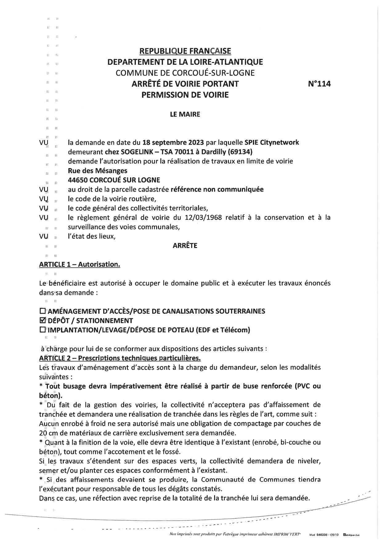 Arrêté N°114 -SPIE Rue des Mésanges